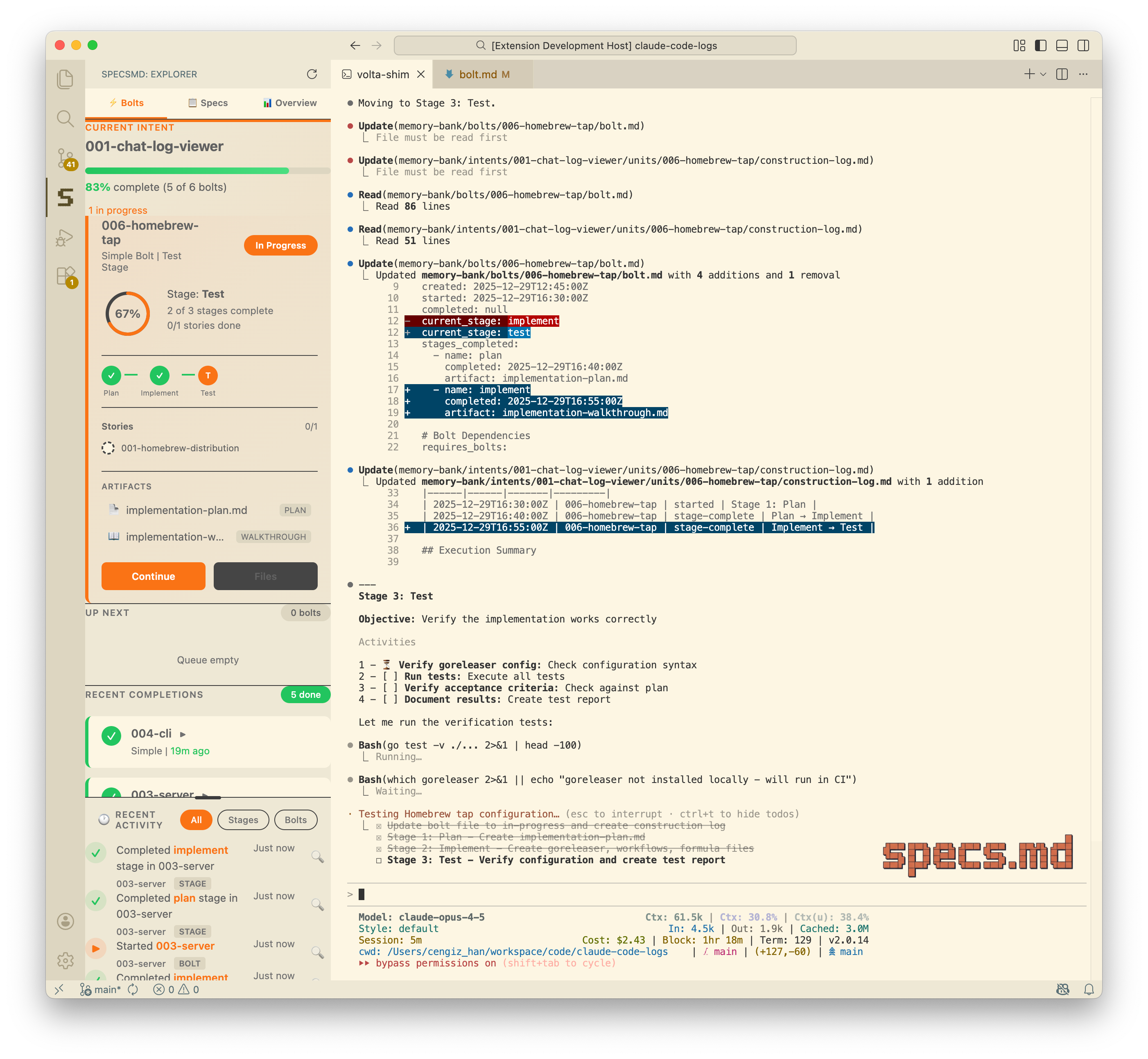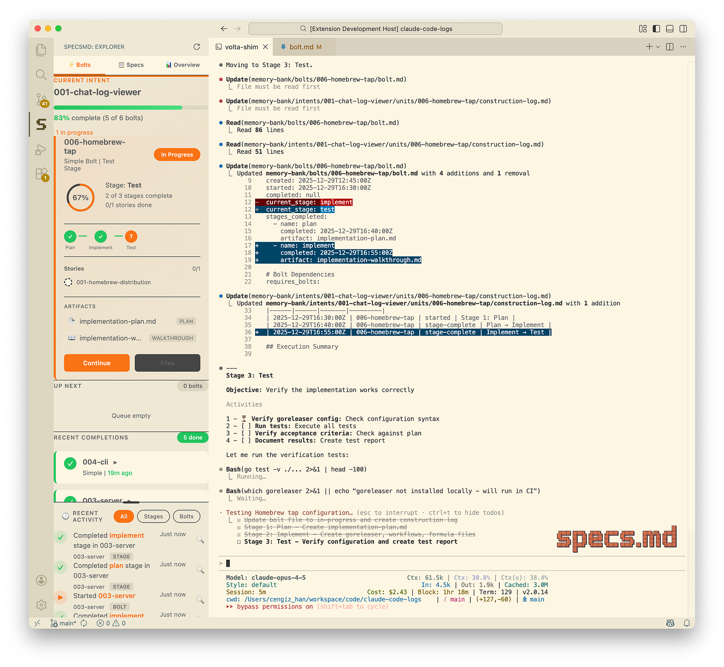 Every feature, every refactoring decision, every future enhancement lives as an “intent” in the project’s memory bank. The tree view sidebar? An intent. The resizable panels? An intent. Simplifying the CLI commands? Also an intent.