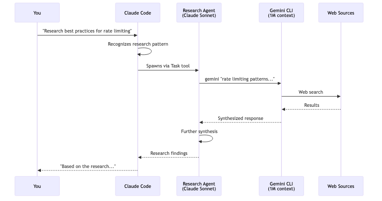 When I’m in Claude Code and need research, the system recognizes research-oriented requests and spawns the Gemini agent: