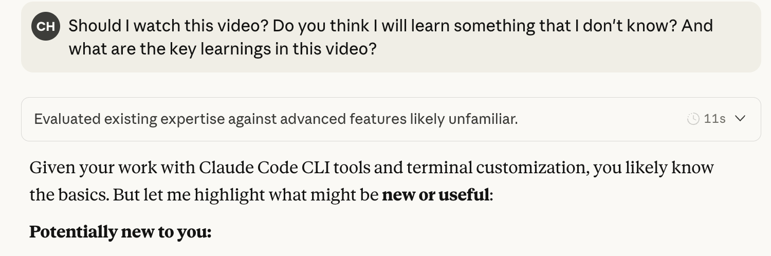 Claude doesn’t just summarize the video. It evaluates what I already know against what’s in the video, then tells me what’s actually NEW or useful for ME specifically.