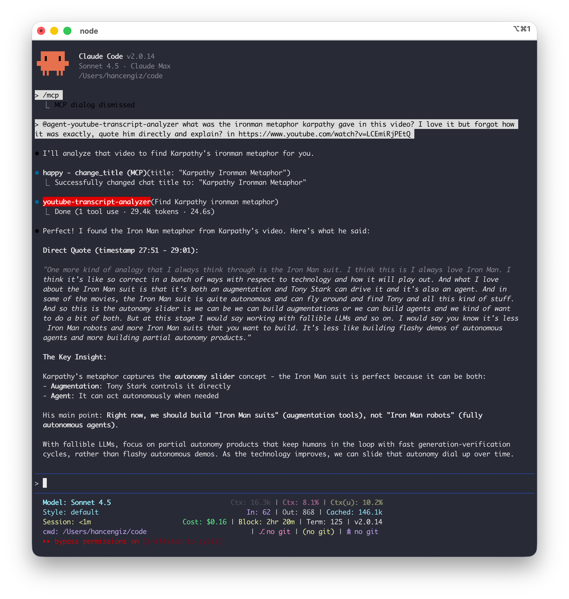 “@agent-youtube-transcript-analyzer what was the ironman metaphor karpathy gave in this video? I love it but forgot how it was exactly, quote him directly and explain? in https://www.youtu be.com/watch?v=LCEmiRjPEtQ”